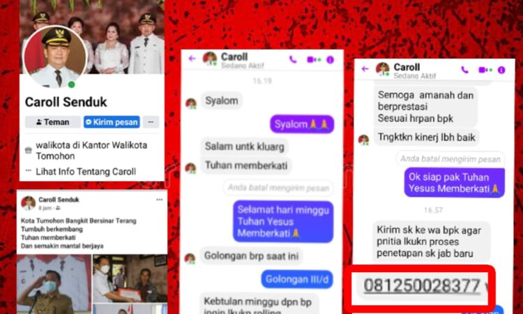 Tomohon – Penipuan dengan menggunakan Akun facebook yang mengatasnamakan pejabat publik pada lingkungan Pemerintah Kota Tomohon, kembali terjadi. Kali ini akun facebook yang mengatasnamakan Wali Kota Tomohon Caroll Senduk beredar di media sosial.
