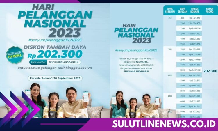 SULUTLINENEWS.CO.ID, JAKARTA – PT PLN (Persero) memberikan diskon spesial program tambah daya listrik dalam rangka memeriahkan Hari Pelanggan Nasional (HPN) 2023 yang jatuh pada 4 September 2023. Pelanggan PLN dapat menikmati promo penambahan daya hanya dengan harga Rp202.300 untuk semua golongan tarif listrik hingga 5.500 volt ampere (VA). Program promo tambah daya ini berlaku mulai 1 September hingga 30 September 2023.