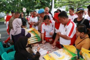 SULUTLINENEWS.CO.ID Polda Sulawesi Utara bekerja sama dengan Bulog Sulut menggelar pasar murah, usai olahraga bersama personel Polda Sulut, di halaman parkir Mapolda Sulut, Jumat (8/3/2024).
