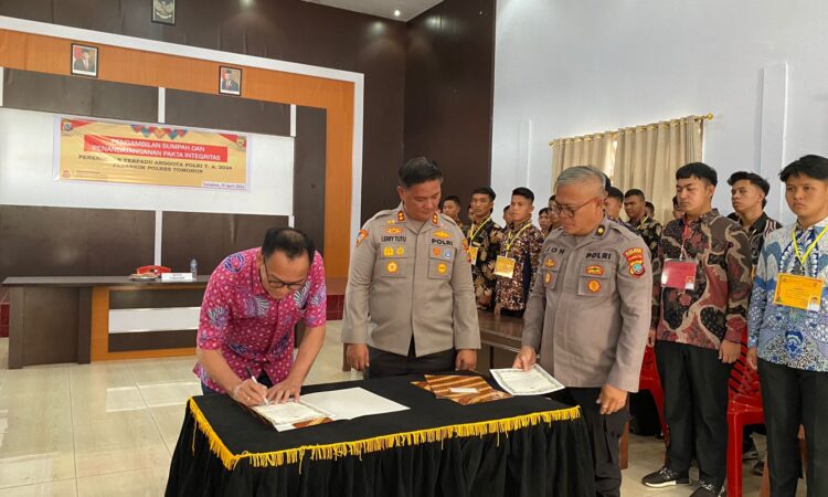 Tomohon – Walikota Tomohon menghadiri kegiatan Pengambilan Sumpah Dan Penandatanganan Pakta Integritas Penerimaan Terpadu Anggota POLRI TA 2024 Pabanrim Polres Tomohon sekaligus menandatangani Pakta integritas yang bertempat di Aula Polres Tomohon, pada Jumat (19/04/2024).