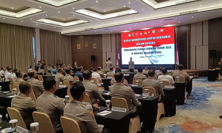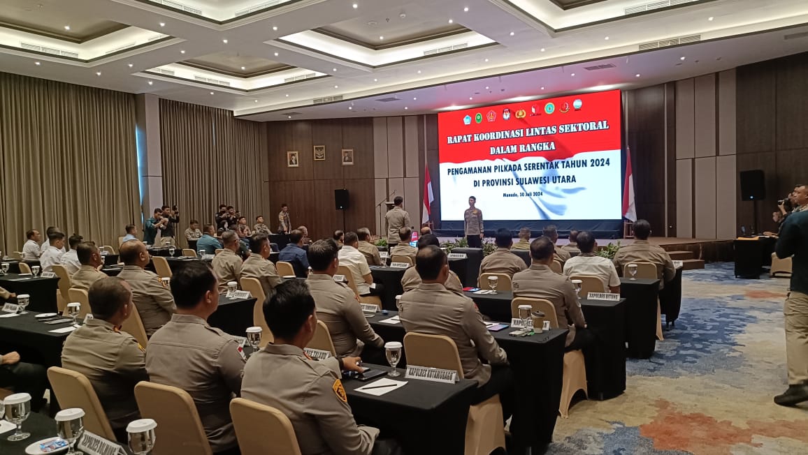 Polda Sulawesi Utara (Sulut) menggelar rapat koordinasi lintas sektoral dalam rangka persiapan pengamanan Pemilihan Kepala Daerah (Pilkada) serentak tahun 2024. Acara yang berlangsung di Hotel Roger Manado ini dibuka langsung oleh Kapolda Sulut, Irjen. Pol Yudhiawan, didampingi Wakapolda, Brigjen Bahagia Dachi, dan hadir seluruh Kapolresta/ Kapolres se-Sulawesi Utara, Selasa (30/07/2024)