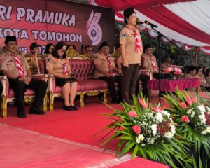 Tomohon – Ketua Kwartir Cabang (Kakwarcab) Gerakan Pramuka Kota Tomohon, Kak drg. Jeand’arc Karundeng, memimpin Apel Peringatan Hari Pramuka yang ke- 63 Tahun, bertempet di