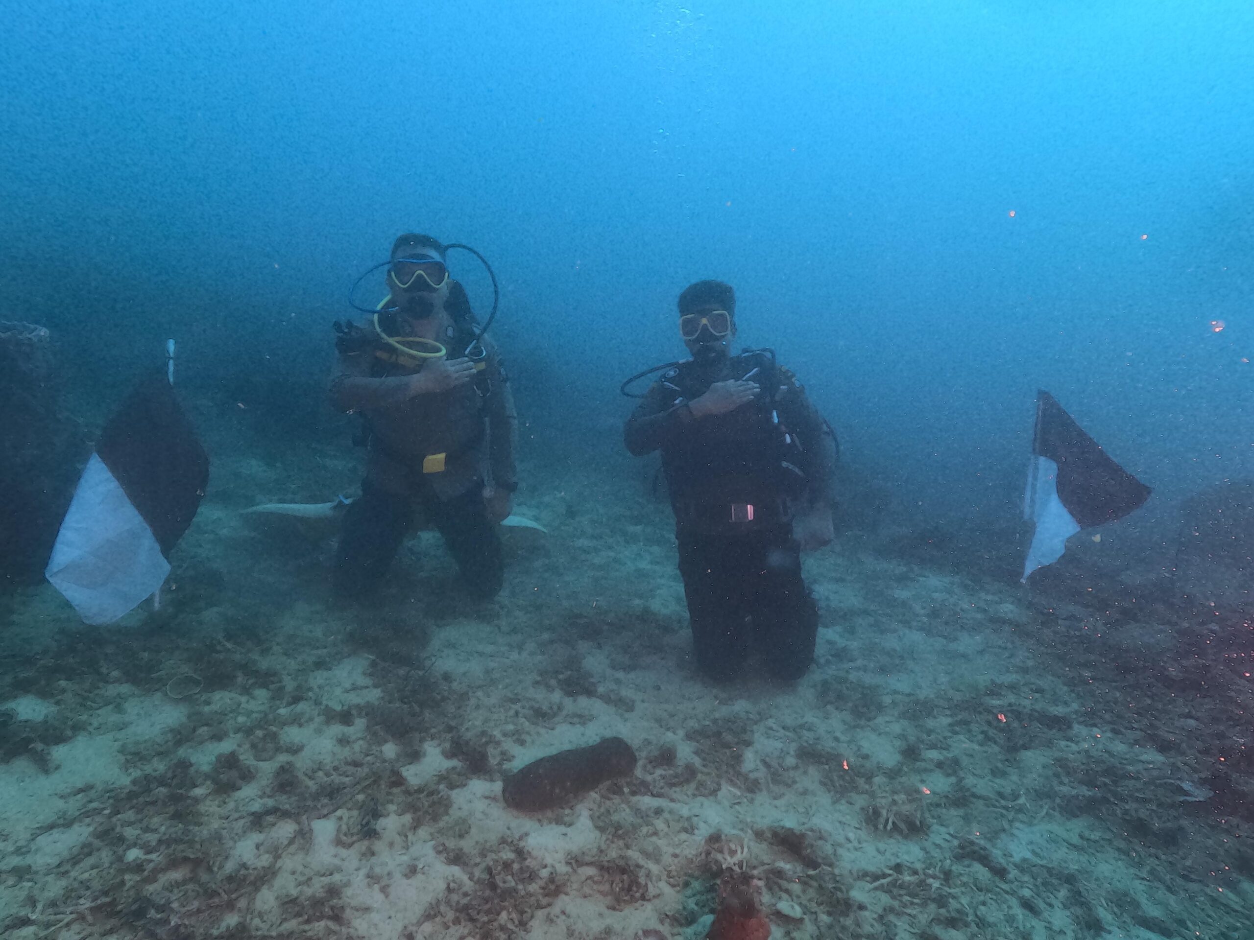 Dengan mengenakan peralatan selam lengkap, rombongan penyelam membawa bendera merah putih ke dasar laut dan mengibarkannya dengan Hidmat.