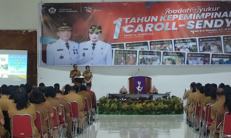 Sulutlinenews – Wali Kota Tomohon Caroll J.A. Senduk bersama Wakil Wali Kota Sendy G.A. Rumajar mensyukuri satu tahun masa kepemimpinan periode 2025–2030 melalui ibadah syukur yang digelar bersama jajaran Pemerintah Kota Tomohon, Senin (23/2/2026). Momentum ini menjadi refleksi atas perjalanan pemerintahan sekaligus komitmen melanjutkan pembangunan di berbagai sektor.